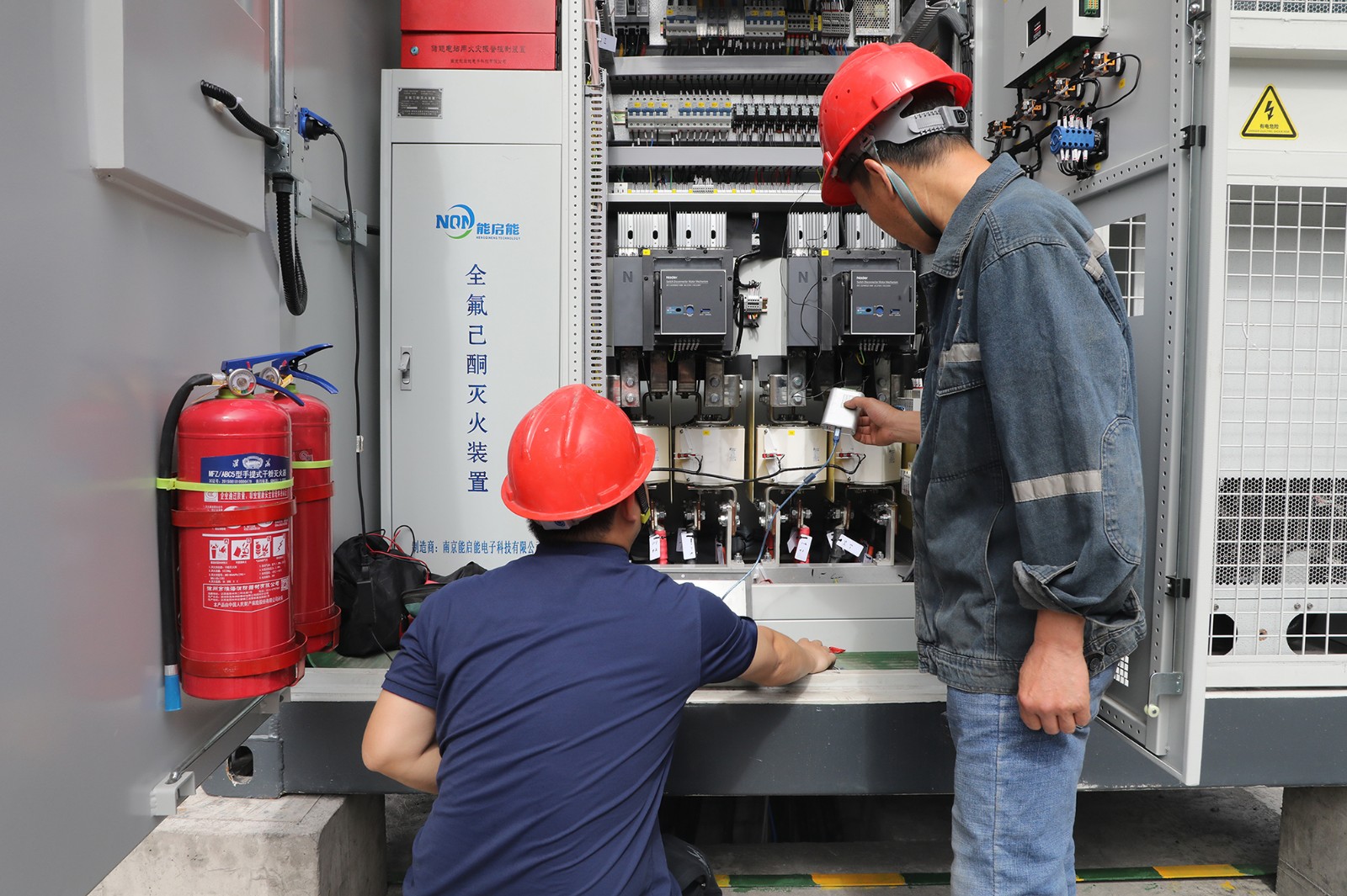 自4月中旬以來,新系統(tǒng)儲能電池艙、儲能逆變器、聯(lián)絡(luò)開關(guān)柜等主要設(shè)備運(yùn)抵后,機(jī)電隊(duì)迅速完成吊裝,并實(shí)現(xiàn)與變電站內(nèi)原開關(guān)柜組的耦合。本周,隨著子系統(tǒng)儲能管理系統(tǒng)控制柜的抵達(dá),綜合調(diào)試全面展開。此次調(diào)試涵蓋多個方面,電池艙內(nèi)的液冷、消防、除濕機(jī)等輔助系統(tǒng)接受細(xì)致檢測;升壓艙進(jìn)行送電測試;儲能逆變器艙與電池艙之間的通訊也在緊張調(diào)試中。