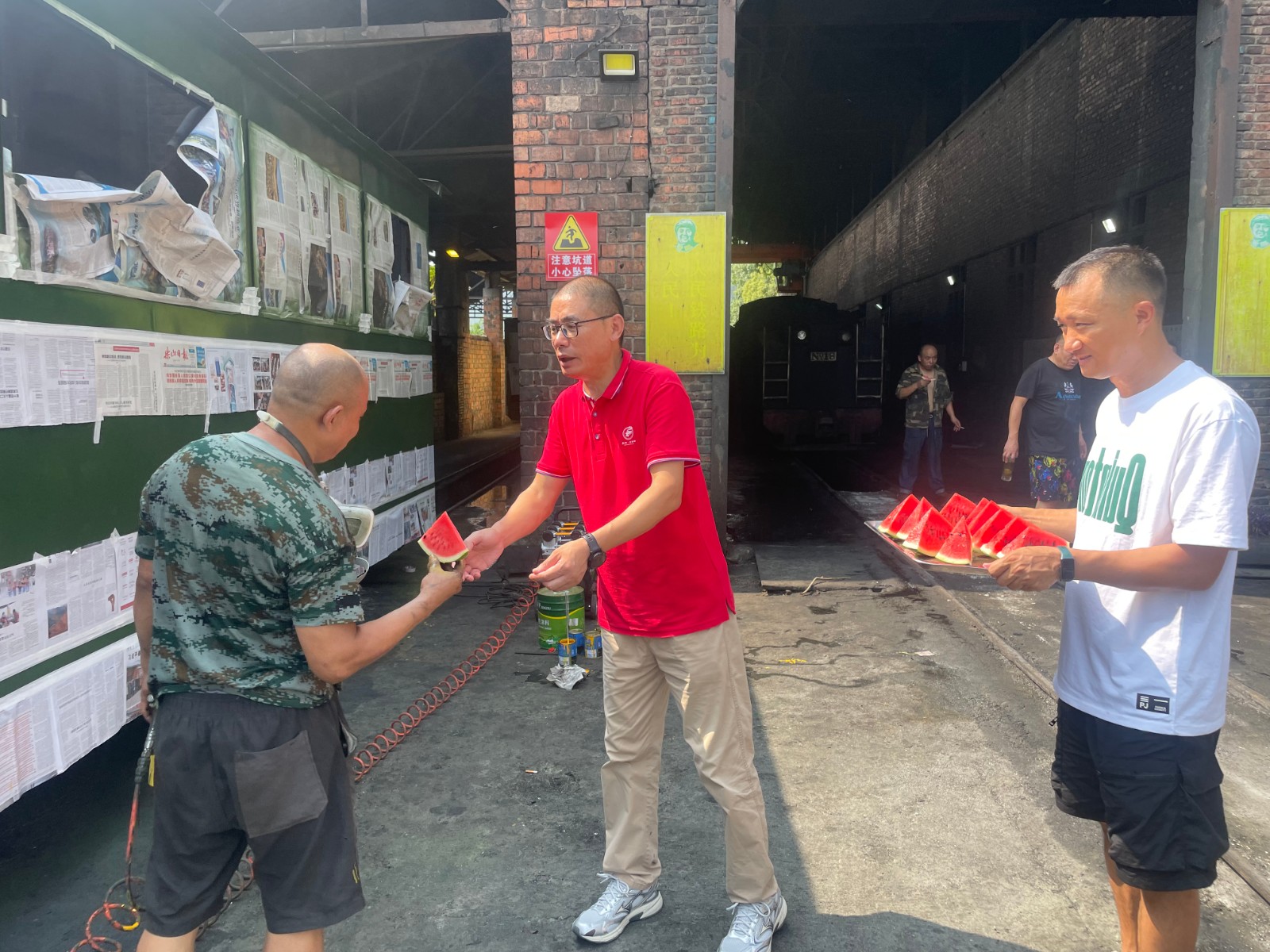 暑假旅游季開啟,嘉陽小火車的司機司爐等高溫崗位人員也面臨一年中最大的一場“烤”驗,蒸汽火車駕駛室的溫度高達(dá)60-70攝氏度,司爐工還需要不時的給火車放灰、清理爐膛……為確保小火車的安全正常運行,火車運營管理部合理安排司機、司爐的作業(yè)時間保障其安全駕駛,同時加強火車的維護(hù)檢修、道路隱患排查工作;為了保障一線人員的身體健康,工會的同志精心準(zhǔn)備了“清涼禮包”,每天為出車司機發(fā)放冰凍礦泉水、西瓜等,每星期定期開展送西瓜、冰粉、涼糕活動,全方位為職工防暑降溫“保駕護(hù)航”。