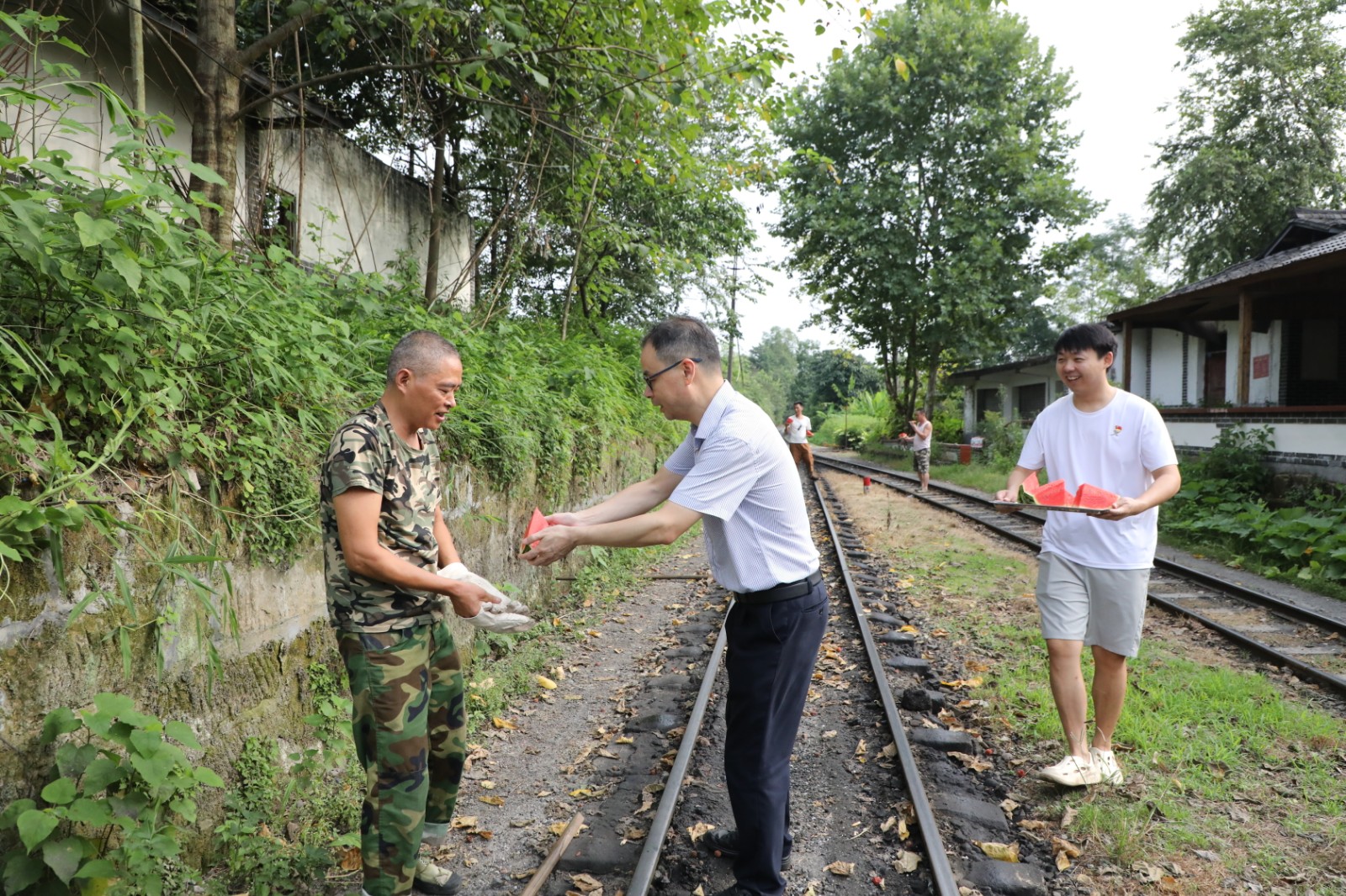 “兄弟們,把手中的活放一放,過來吃口西瓜涼快涼快……”,在火車機頭、在檢修車間、在芭石鐵路、在黃村井井口、在芭蕉溝花圃……紀委書記呂明強一邊招呼著火車司機、檢修工、道班維修工、講解員、花圃養(yǎng)護工……一邊將切好的西瓜送到他們手中。每到一處,呂明強認真了解他們的工作情況,仔細叮囑他們合理安排作息時間,盡可能避開高溫時段在烈日下工作,同時要準備好防暑藥品,落實好防暑措施,防止高溫中暑。