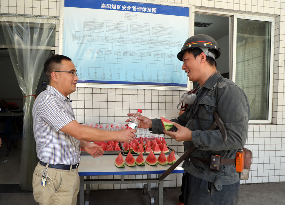 15日下午兩點(diǎn),火辣辣的太陽把地面曬得發(fā)燙,一股熱浪迎面撲來。黨委書記、董事長杜勤率機(jī)關(guān)第一黨支部、第二黨支部的黨員來到嘉陽煤礦天錫井工業(yè)廣場,現(xiàn)場給大家加油鼓勁,“大家辛苦了!吃塊西瓜涼快涼快,我代表公司、黨委感謝大家,向你們表示敬意。”“面對炎熱的天氣,你們堅(jiān)守崗位辛勤工作,戰(zhàn)高溫、斗酷暑,保生產(chǎn)、增效益,為公司生產(chǎn)經(jīng)營做出了貢獻(xiàn),希望你們保持良好的身體狀態(tài),注意安全”。在離礦區(qū)十公里處的反斜井堆矸場,杜書記把工人們召集在一塊兒坐下來吃西瓜,一邊吃一邊聊,像兄弟一般親切地與之談心,關(guān)心大家在這兒的班中餐安排得怎樣,并叮囑大家工作時(shí)要注意安全,做好防暑降溫。