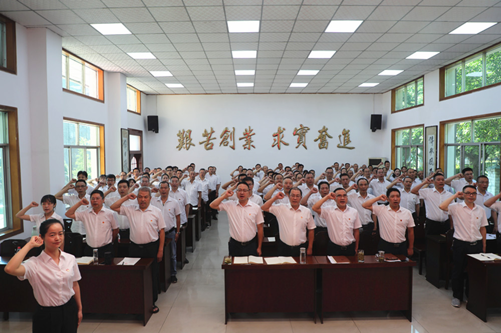 面對鮮紅的黨旗,100名共產黨員舉起右手,發(fā)出錚錚誓言,響亮的聲音在辦公樓久久回蕩。