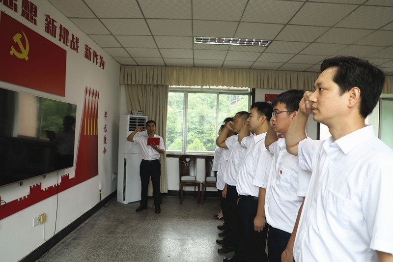 “我志愿加入中國共產(chǎn)黨,擁護黨的綱領,遵守黨的章程,履行黨員義務,執(zhí)行黨的決定,嚴守黨的紀律,保守黨的秘密,對黨忠誠,積極工作,為共產(chǎn)主義奮斗終身……在黨群工作部部長姚建軍的領誓下,新黨員們莊嚴宣誓。